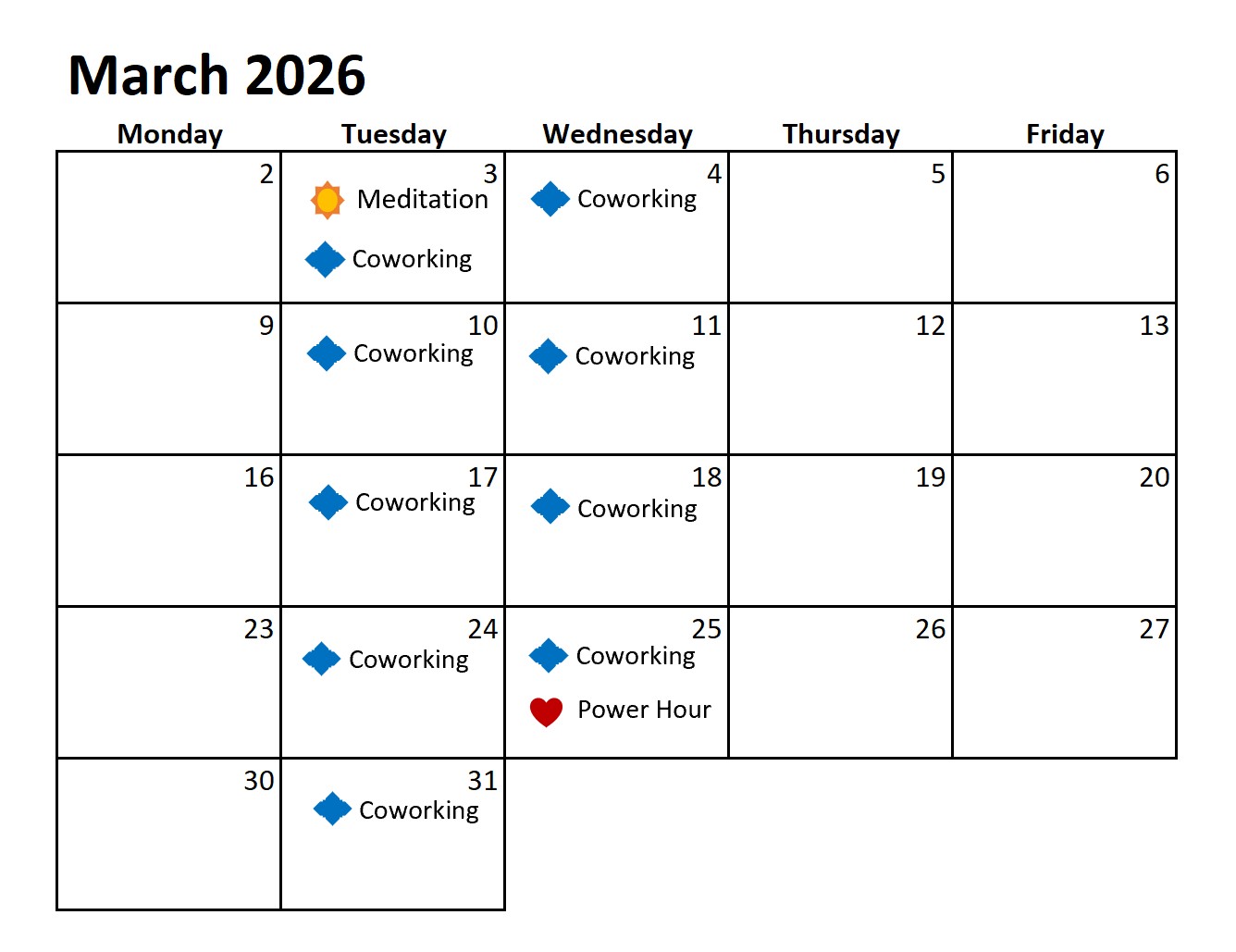 2) Mark your calendar for a week of Group Coworking sessions (Tuesdays and Wednesdays 9-11 am PT)